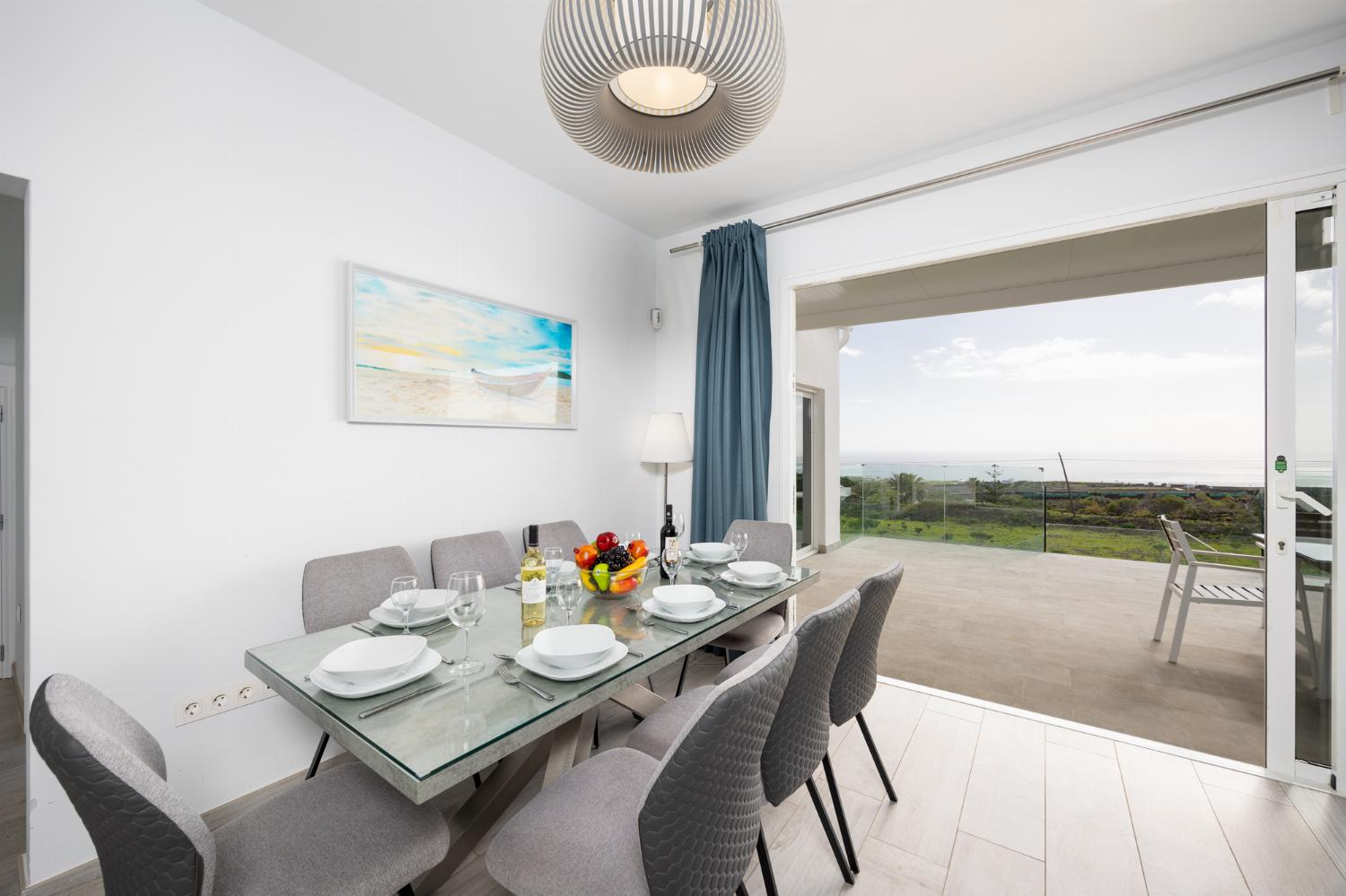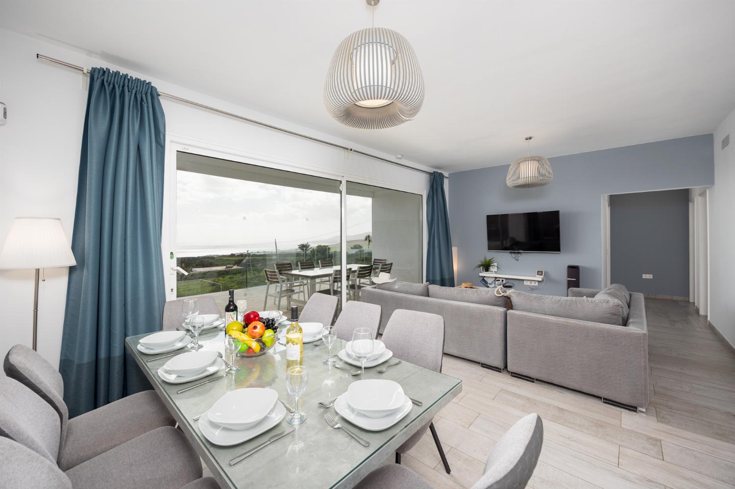 The living room is air-conditioned and has a dining area, comfortable sofas, TV and Free Wi-Fi. There are patio doors to the pool terrace.