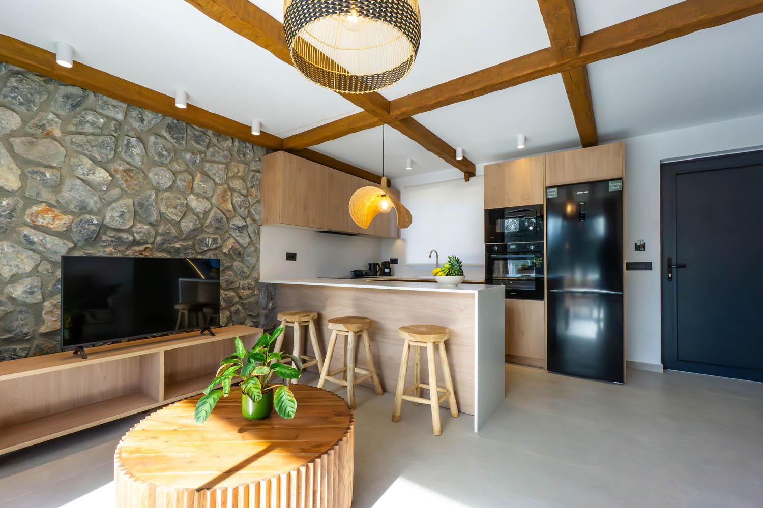 The kitchen features a toaster, coffee maker, granite work top, washing machine, microwave, refrigerator, stove/hob and oven. There is also a barbecue outside.